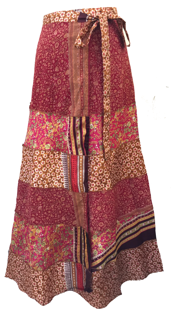 Fair Trade Tiered Full Length Sari Silk Reversible Wrap Skirt - Red / Pink Design