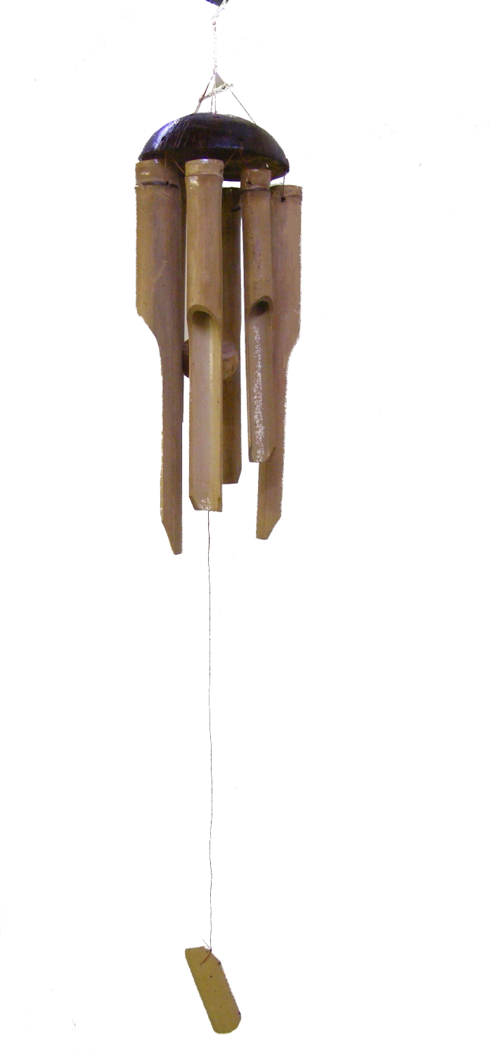 The chimes are hand cut from locally grown bamboo and the crown is made from a locally grown coconut. The coconut and the bamboo are varnished to make them suitable for outdoor use, the string is waxed cotton so that it does not rot.
