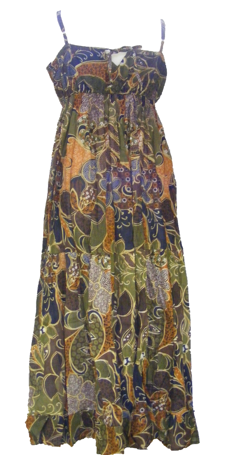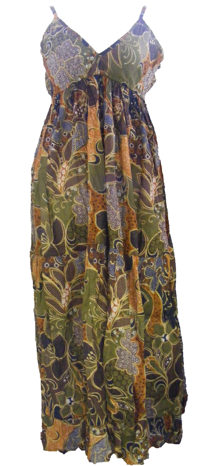 They come in a lovely bold hibiscous flower print the choice of three colours; earthy brown, bright blue flowers and pastel shades and come in two sizes 10/12 & 14/16. Length 132 cm from shoulder to hem.